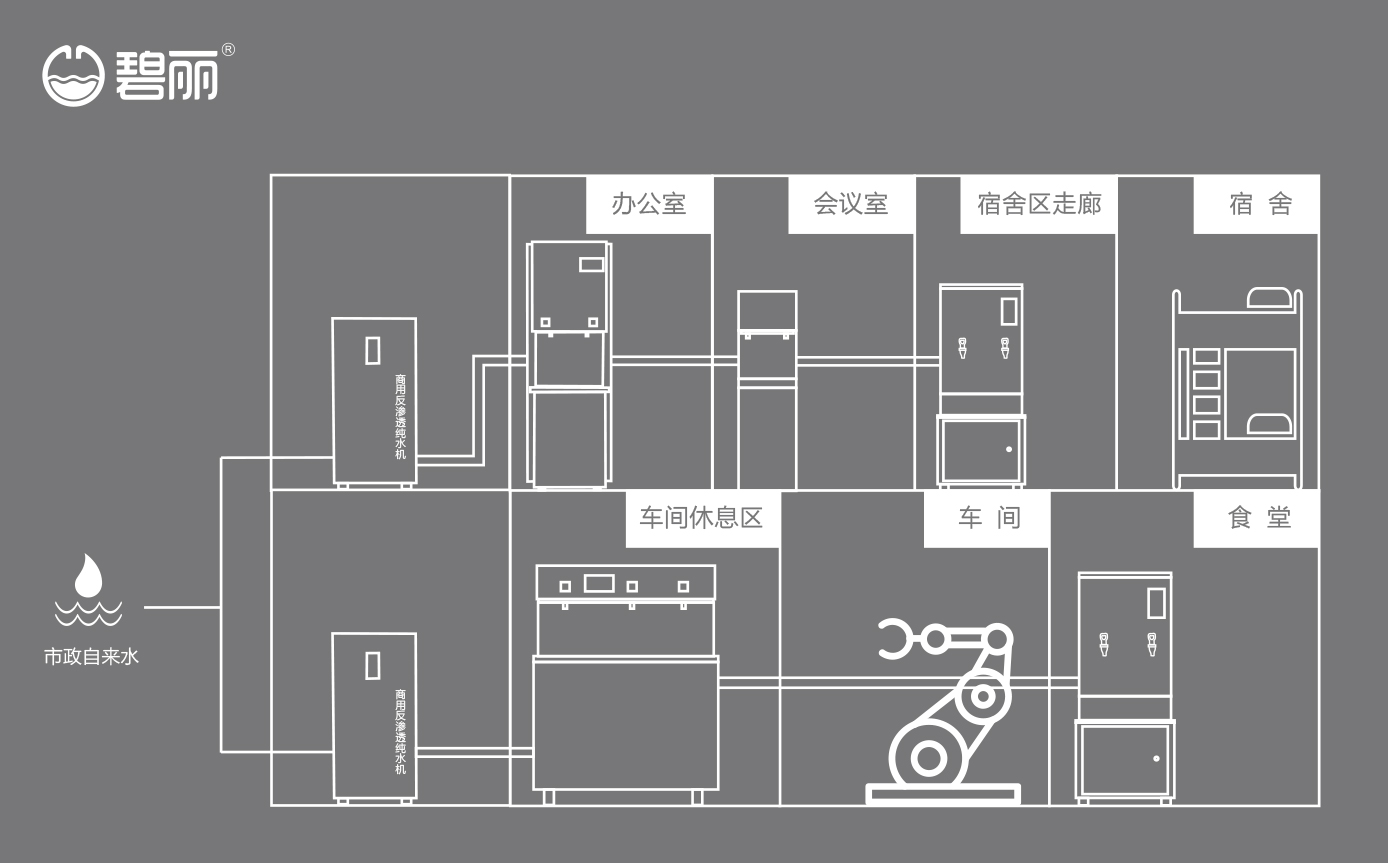 碧麗商用反滲透純水機將自來水集中處理后,把優(yōu)質(zhì)的純凈水通過專用的供水管道輸送到各飲水點;